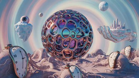 A surreal dreamlike landscape filled with floating objects illustrating the fluid everevolving nature of understanding in the fields of quantum mechanics and theoretical physics