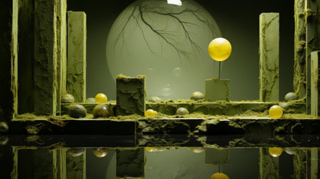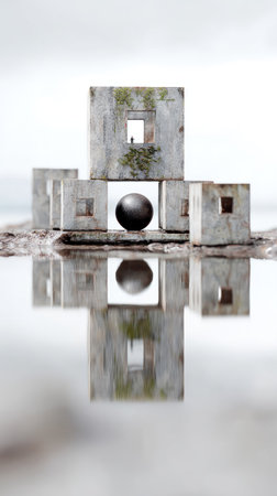 An abstract composition features a central black sphere positioned between weathered, concrete-like square structures. The visual is minimalist with muted tones, creating a sense of balance. The reflective surface below mirrors the arrangement. Suitable for use in conceptual designs or artistic editorials, the image has copy space.