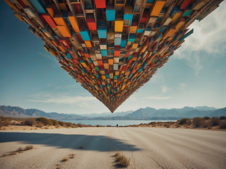 a man stands in the desert, gazing into a mirror in this minimalist stage design. this conceptual digital art piece is rendered in 8k resolution, featuring mind-bending sculptures. the scene evokes the work of richard serra and the romanticism of moonlit seascapes. ai generated