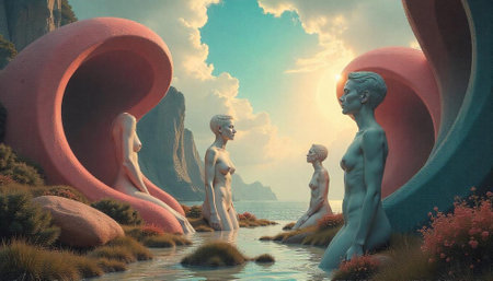 Step into a vibrant digital gallery showcasing virtual artwork amid ethereal landscapes and captivating avatars, inviting exploration and creativity.