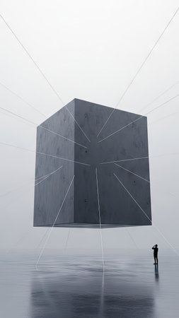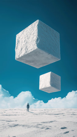 A surreal scene featuring two massive cubes hovering above a lone figure in a vast barren landscape under a vibrant blue sky evoking feelings of wonder.