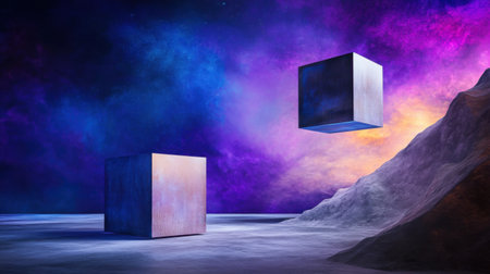 Cubes suspended in futuristic abstract space, glowing with deep blues and violets