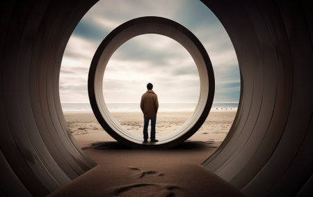 Surreal picture, a man standing in a tunnel on a beach. AI generative image.