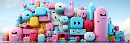 funny pink detail of children's toy constructor with eyes on a blue-yellow background, original idea mock up copy space