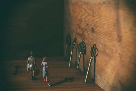 Creative concept. Man silhouette standing at giant baby pacifier on wooden table with low key toned background. Selective focus