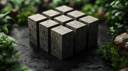 Geometric concrete blocks juxtaposed with vibrant greenery create a serene atmosphere.