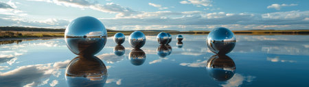 Serene Reflections: Mirrored Spheres on a Tranquil Lake