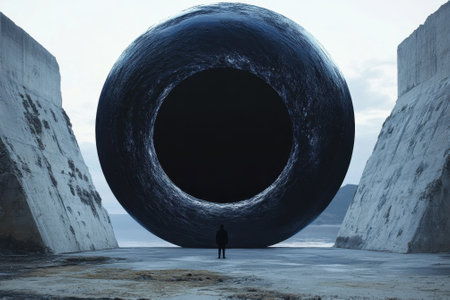 A person stands in front of a massive black sphere between two concrete cliffs at dusk, creating an intriguing encounter.