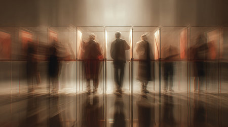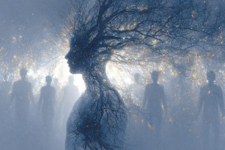 A lone individual strides along a glowing corridor, surrounded by hazy, drifting figures on either side, evoking introspection amid a shrouded, dreamy setting.