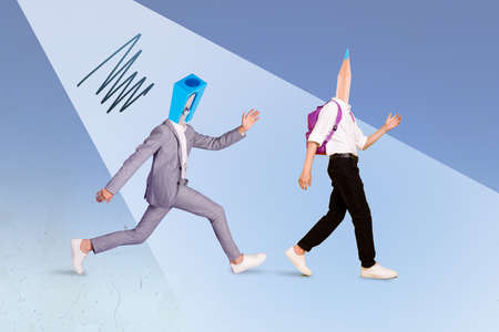 Composite collage picture of two boys pencil sharpener instead head walking spot light isolated on painted background