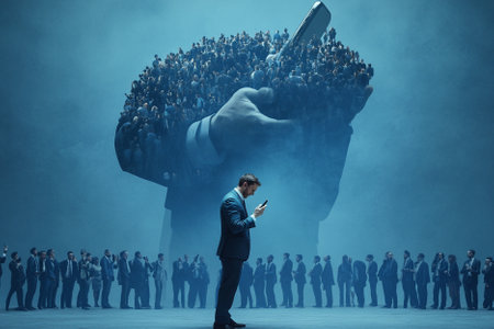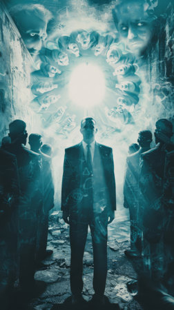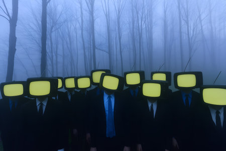 Surreal digital art of businessmen with tv heads controlled by an evil puppet master in dark suits