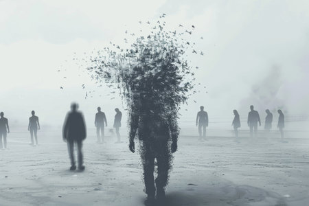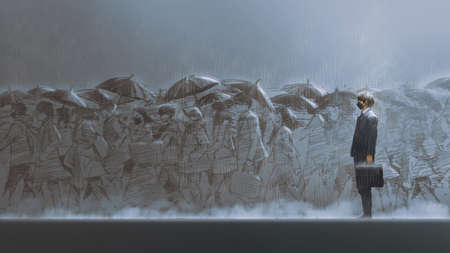 Conceptual image of single male figure amongst blurred figures