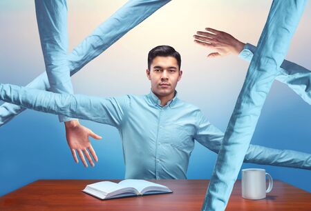 Instead of a brain, a man has a multi-armed businessman in his head. Creative picture, concept of multitasking, multi-hands, brain work, stress resistance