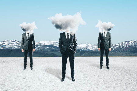 Cloud headed businessmen standing on landscape background. Confusion concept