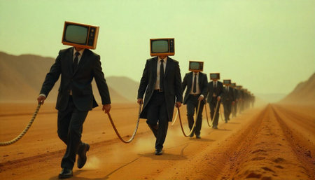 Desert march of TV-headed figures pulling ropes, surreal art