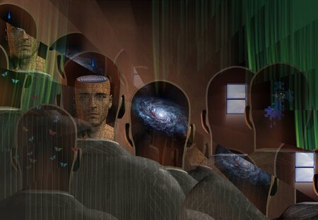 Surreal consciousness. Men with dreams in their head stands before drapes. Field behind drapes.
