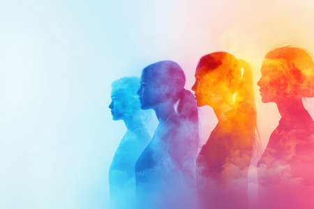 Four female figures are shown in profile, surrounded by vibrant blue and orange smoke, symbolizing diversity.