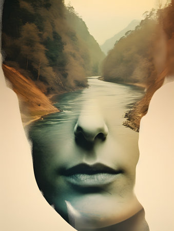 Double exposure portrait of a woman combined with a landscape image of a mountain river.
