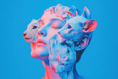 Surreal portrait featuring a woman s face intertwined with animal sculptures in vibrant blue and pink hues, representing harmony with nature and inner emotions