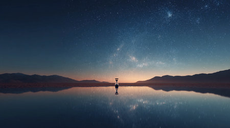 A vintage hourglass sits on a mirrored surface of a desert as stars fill the evening sky.