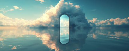Surreal doorway on tranquil sea surrounded by clouds, dreamlike landscape concept