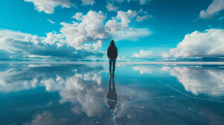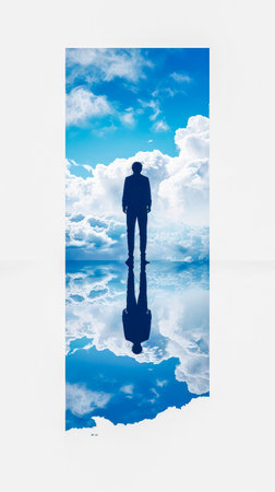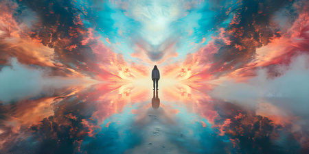 person standing before a surreal landscape, where the sky and clouds are reflected below, creating a visual metaphor for reflection, aspiration, and the boundless nature of the human spirit