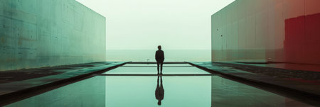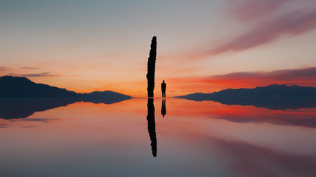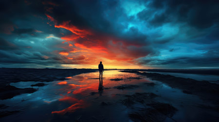 Lone figure before an epic sunset reflected on calm waters. A powerful reflection of solitude and the grandeur of nature. Concept of self-discovery, reflection, and vast horizons. Digital art