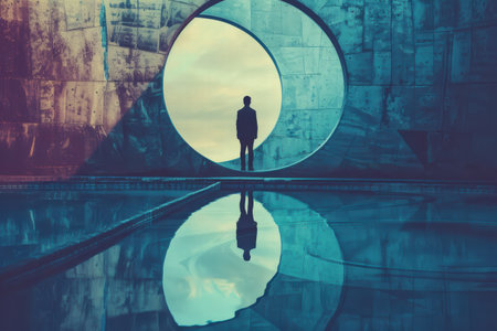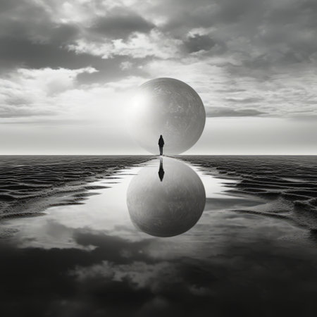 A solitary figure stands before a bright, spherical light, reflecting in a smooth surface. The monochromatic color palette and atmospheric lighting create a sense of mystery. This conceptual image can be suitable for various uses, including artistic projects, editorial content, or abstract designs. The reflective surface adds a visual element.