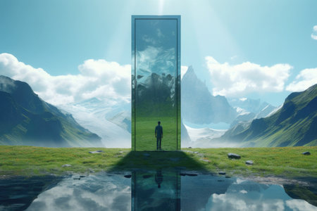 Man silhouette standing in mountain landscape with mirror portal. Travel to fantasy world. Created with Generative AI