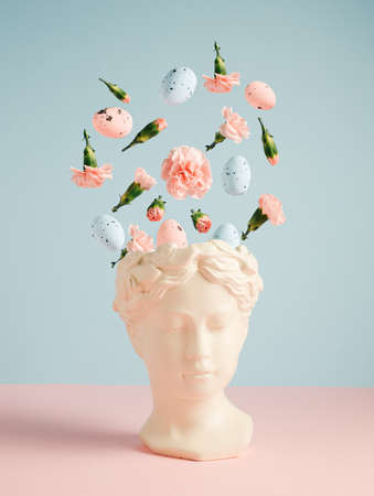 White eggs and fresh flowers flying out of head statue on two tone pastel pink and blue background. Creative spring Easter holiday concept. Minimal still life aesthetic.