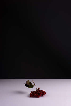 creative autumn minimalistic still life of a red branch of viburnum berries on a black and white background.