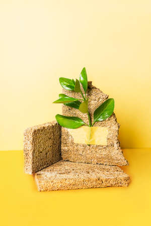 Modern composition with abstract objects and botanical plant. Minimalistic geometric figures on dark background. Natural still life with copy space. 2021 year trend colors - gray and yellow.