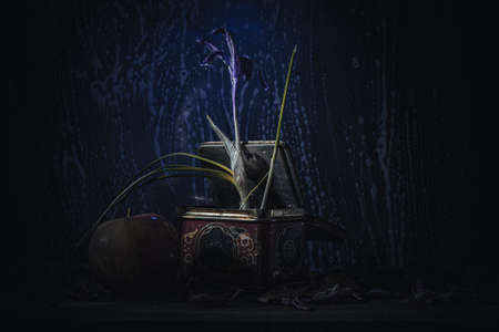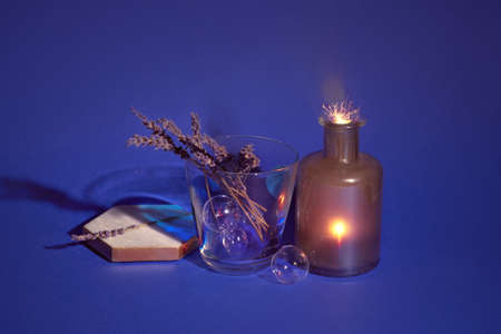 Dry lavender in glass, magic light with sparkles and orange glow. Dark blue, purple paper background. Light, long shadows. Simple minimal still life.