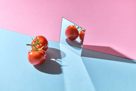 Two tomatoes with green stems are reflected in a mirror on a blue-pink double background with copy space. Healthy vegetable