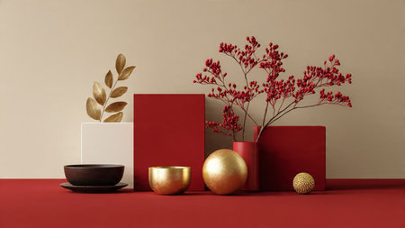 Geometric shapes near vase with twig against yellow background