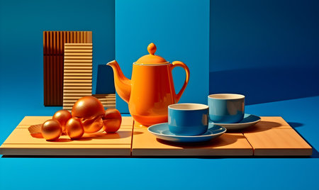 3d illustration of a still life with coffee cups and teapot