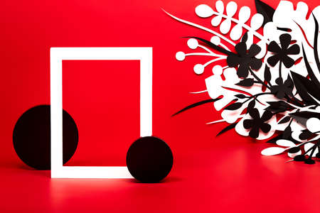 white frame on red and paper cut leaves scene