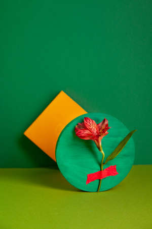 Composition of fresh Alstroemeria flower and yellow sticky notes in green studio