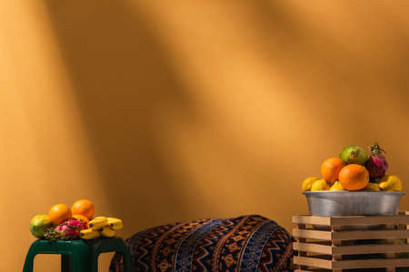 exotic fruits on stool and in metal bowl on orange background on orange