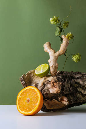 Set of healthy, juicy orange, lime and ginger isolated over green background. Healthy eating, dieting. Vitamin tea ingredients. Concept of grocery, nutrition, taste, health. Colorful image