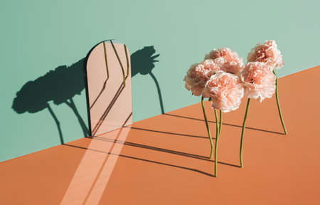 Artificial flowers floating next to a mirror. Surreal artistic floral background.