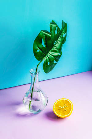 A monstera leaf in a glass vase with water and half a lemon next to it. The concept of minimalism. One leaf of the monstera plant in a vase on a lilac table and a blue background ..