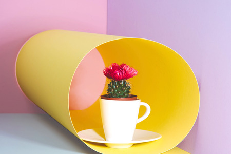 Small cactus in a flowerpot on a trendy background.