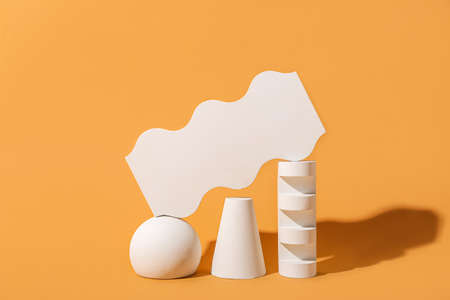 Composition of geometric shapes and colored fans made of cardboard. Concept. Banner