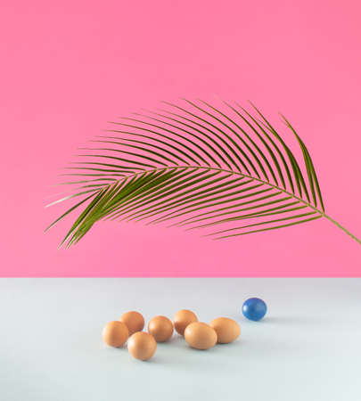 Easter eggs and tropical palm leaf on a white and pink background. Minimal holiday concept with creative copy space.