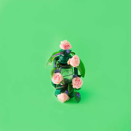 Lantern with spring flowers. Flowering. On a pastel green background.