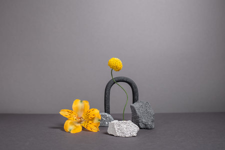 Creative and minimalistic staging of black and white stones, varied shapes and vibrant plants. Modern geometric and natural background with flowers. 2021 year trend colors - gray and yellow