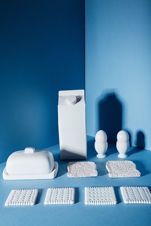 White pack of milk, two eggs, butter, four cookies and two bread slices over blue background