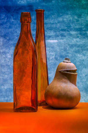 Still life with colored bottles and ripe pumpkin