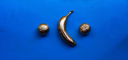 An abstract shot of golden plated bananas and mandarins on a blue background